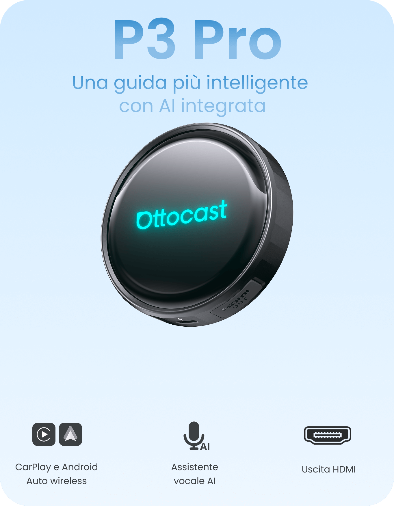 Dal 2009, Ottocast guida l’innovazione nell’elettronica per auto, trasformando i veicoli in spazi digitali intuitivi. Dai primi sistemi CarPlay, agli adattatori wireless CarPlay/Android Auto e alle soluzioni AI, Ottocast offre connessioni rapide e senza sforzo agli automobilisti di tutto il mondo. Affidabile a livello globale, il brand continua a portare avanti la mobilità smart con tecnologie che rendono ogni viaggio più sicuro, fluido e connesso.